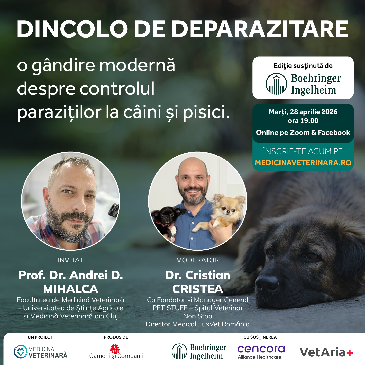 The session was moderated by Dr. Cristian Cristea and was hosted online via Zoom and Facebook. The event was organized as part of the Medicină Veterinară project, with support from Boehringer Ingelheim, Cencora Alliance Healthcare, and VetAria+.